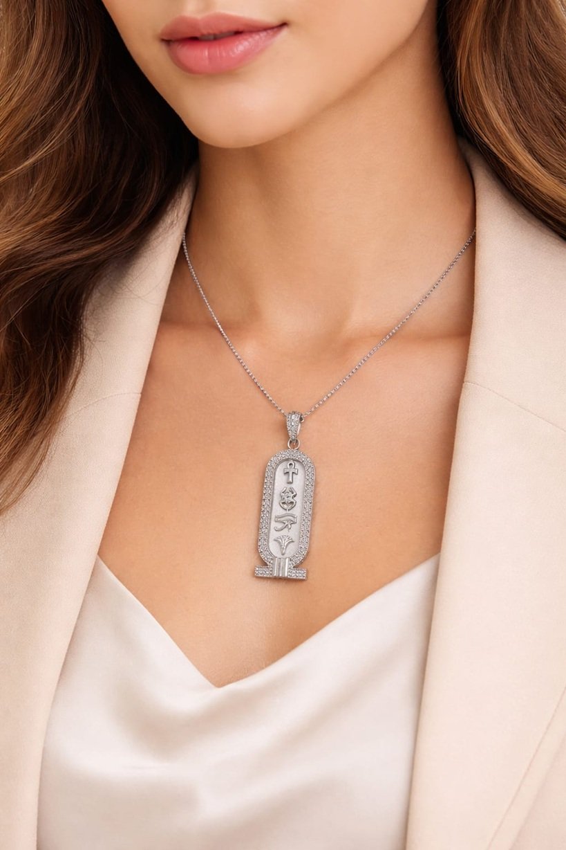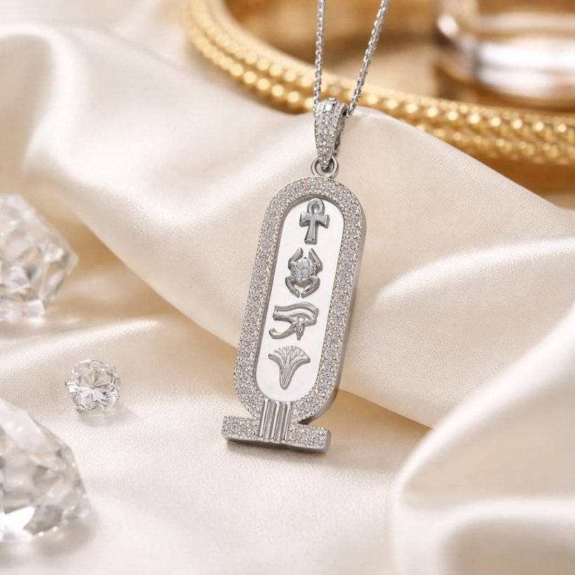 The Egyptian cartouche is one of the most powerful and meaningful symbols from Ancient Egyptian civilization. In ancient times, the cartouche was used to enclose the names of kings, queens, and gods, symbolizing protection, eternity, and royal power. The oval shape represents the universe: the base symbolizes the earth, while the upper oval represents the sky dome, meaning that the name written inside the cartouche is protected by the entire universe.