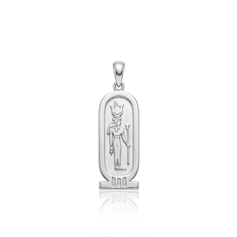 The pendant can be personalized with your name or the name of someone you love engraved on one side. The other side features the goddess Hathor, one of the most important goddesses in Ancient Egypt, symbolizing love, beauty, music, joy, and the sky, making this piece not only jewelry but also a meaningful protective symbol.